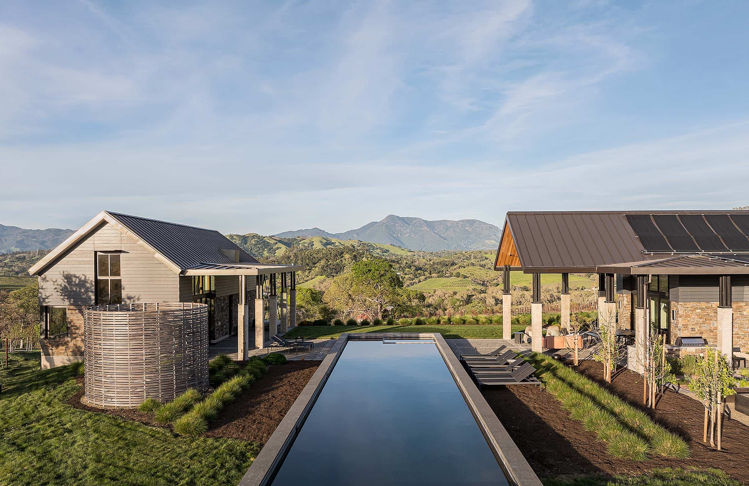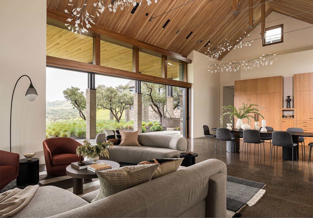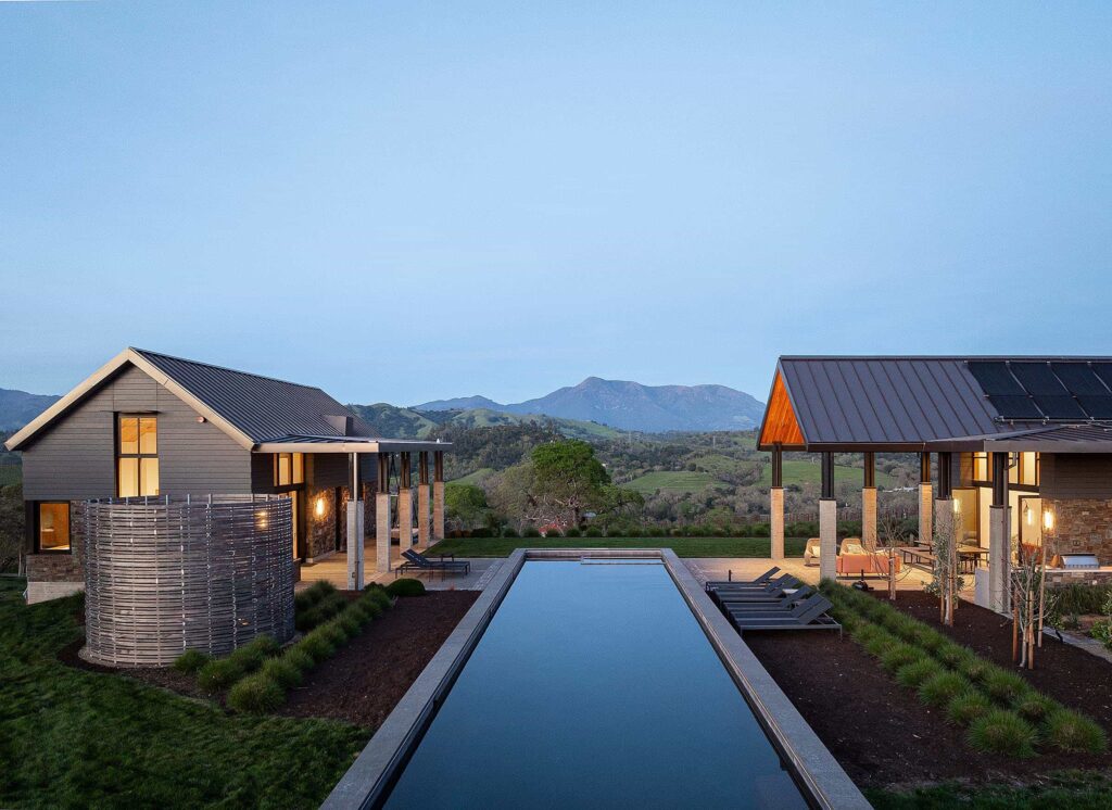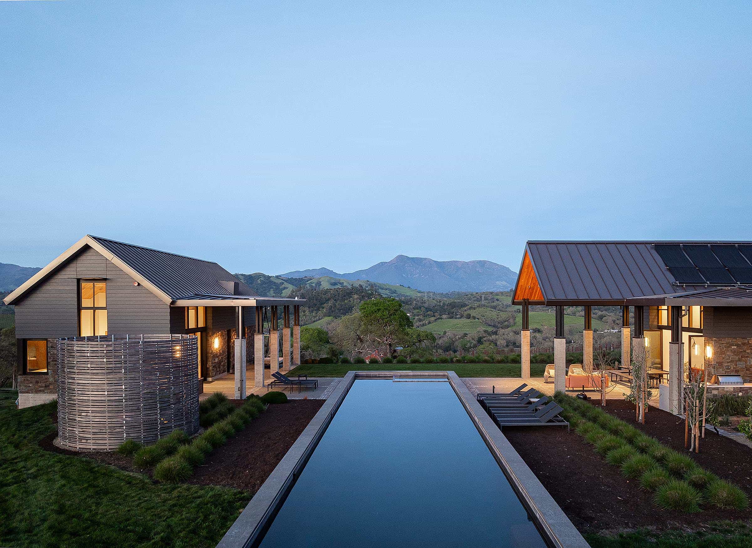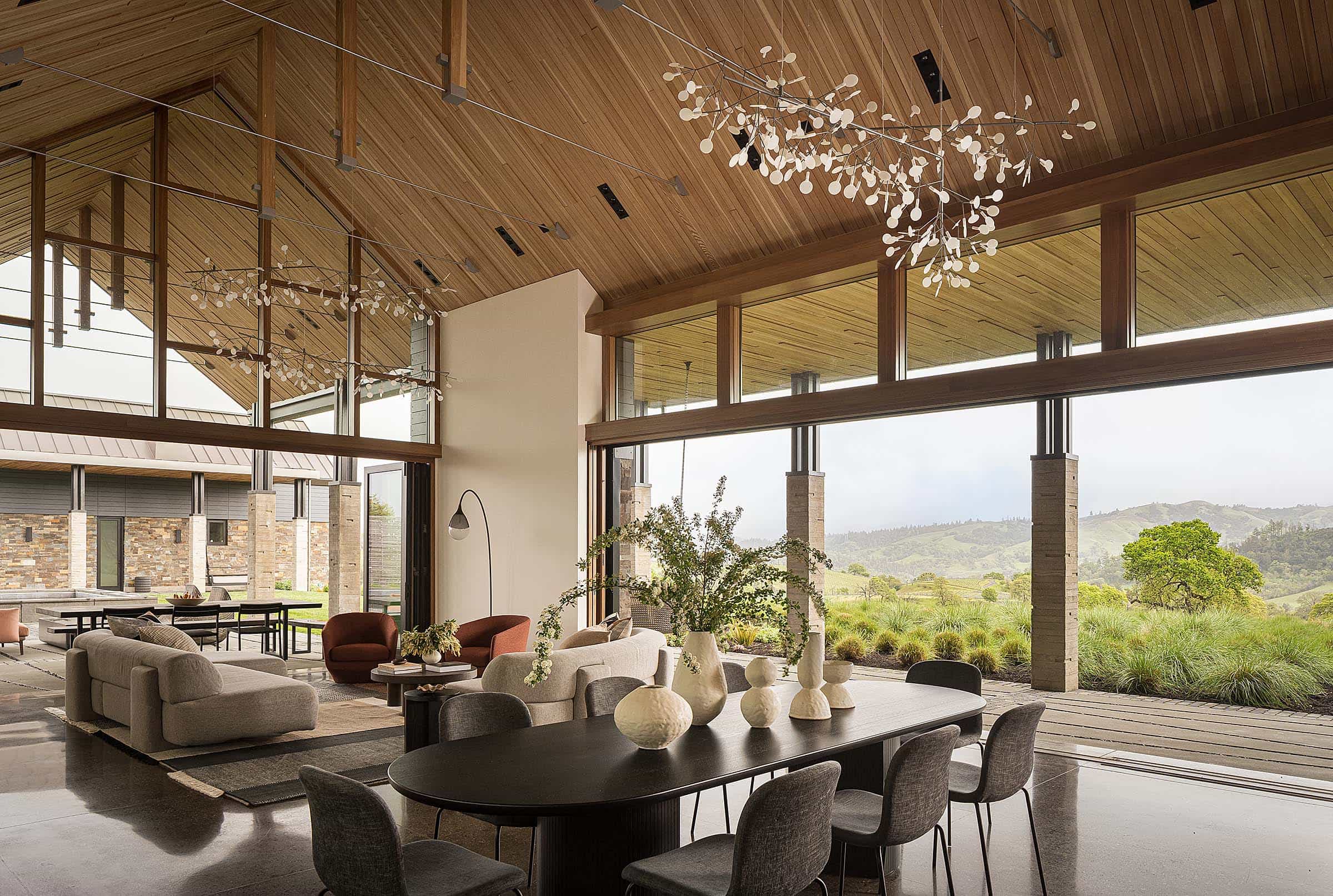 Working with Berkeley-based architect David Wilson, who had designed the previous guest wing, Nordby executed a vision that is as technically resilient as it is visually arresting. The new main house, pool house, and guest accommodations are oriented to fully embrace the panorama of surrounding hills and vineyards. The resulting footprint frames the landscape like a living canvas, with every room and space unfolding toward the horizon.