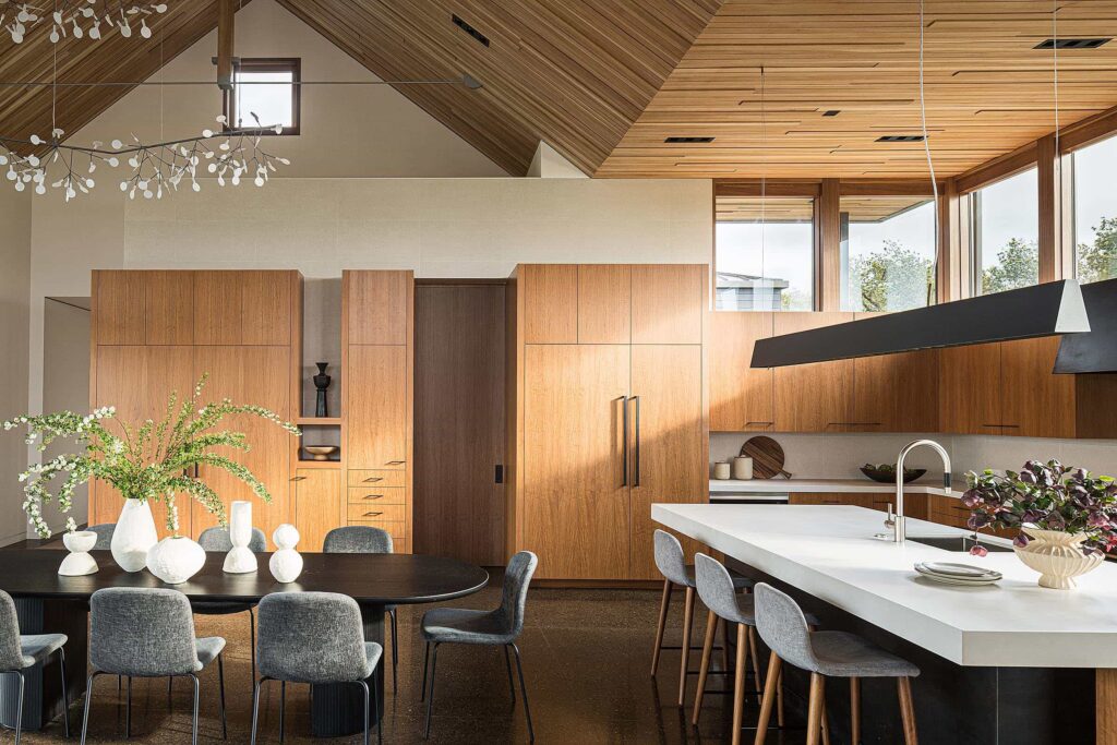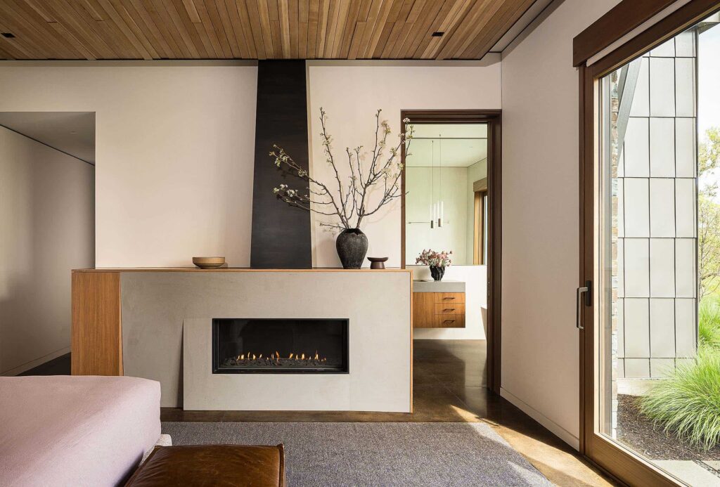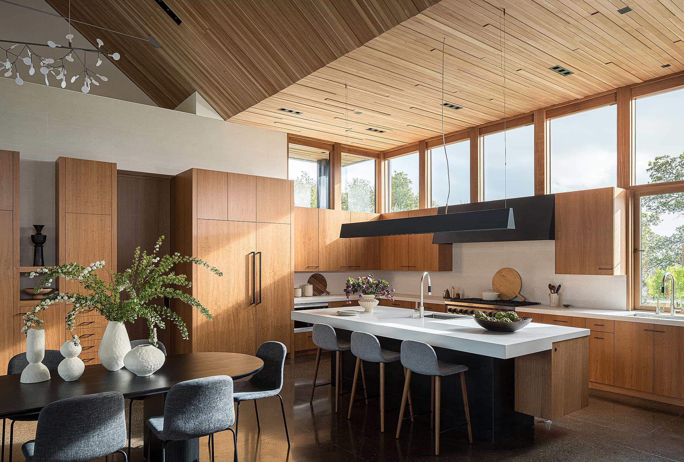 Inside, the house feels both grounded and ethereal. Polished concrete floors on the main level reflect light and landscape, while the upper level transitions to white oak and tile. Ceilings are sheathed in vertical-grain Douglas fir, crafted in varying thicknesses to form an undulating pattern that follows the slope of the roofline and extends to the external eaves.