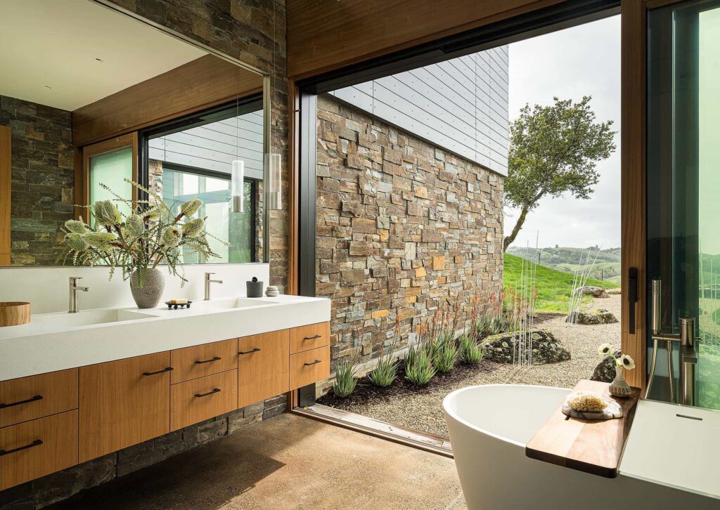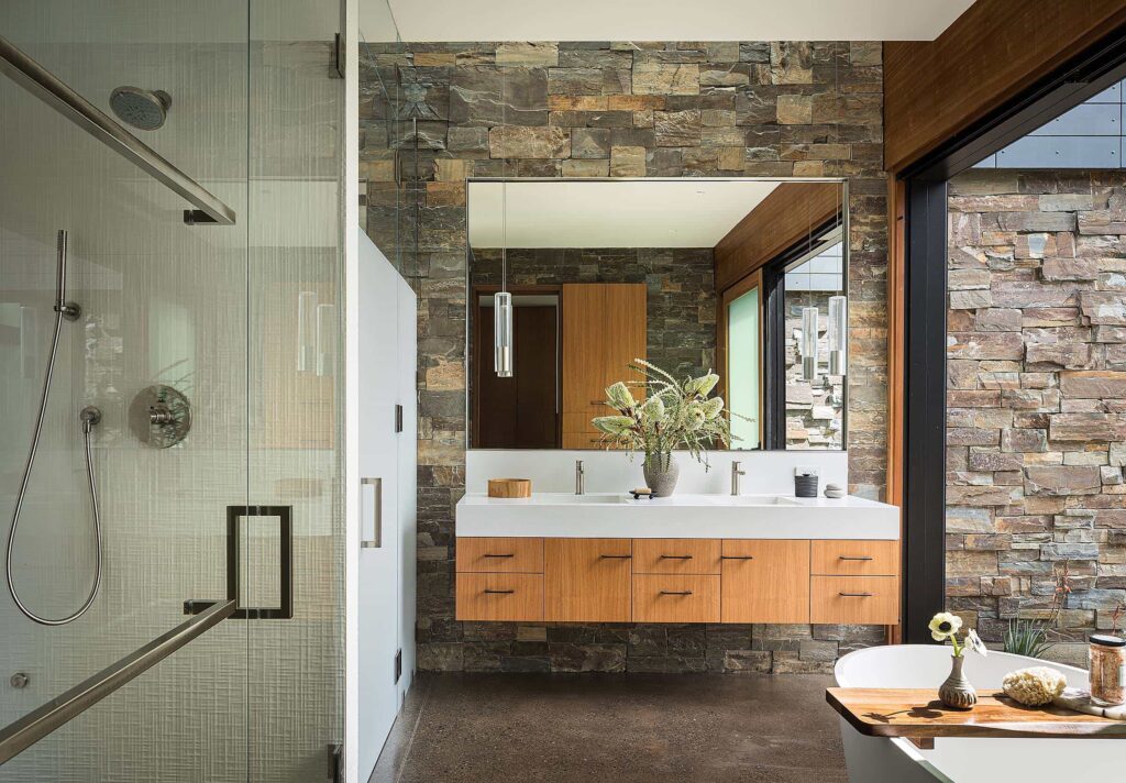 American walnut cabinetry and stone countertops reinforce a material palette of enduring elegance. Bathrooms feature integral white concrete sinks and uninterrupted slab surfaces, all executed with precision to meet the demands of both form and function. In key moments, exterior stonework carries through to interior walls, further blurring the line between indoors and out.